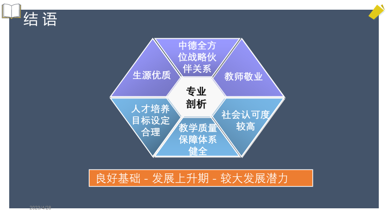 德语专业是一个具有良好基础、处于发展上升期、拥有较大发展潜力的专业,本专业将进一步发挥地域优势,突出专业特色,争取取得长足的发展。