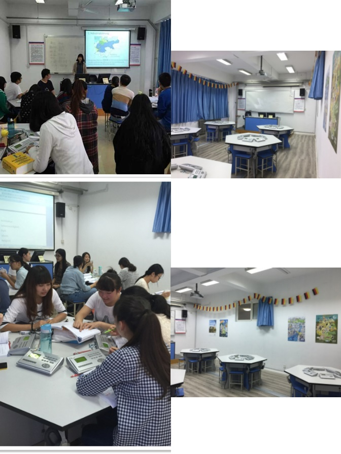 本专业全部课程都在语音室、多媒体教室和智慧教室进行。本系配有专用的多媒体语音教室,学生可在课前和课间收看实时转播的德国电视节目,多媒体设备可供学生在课堂上作报告使用,灵活放置的桌椅突破传统,优化课堂组织形式,方便教师指导学生进行小组练习和自主学习。外教的口语课均在智慧教室进行,其配备先进便利的设备,让口语实践课变得丰富有趣味,有非常好的教学效果。
