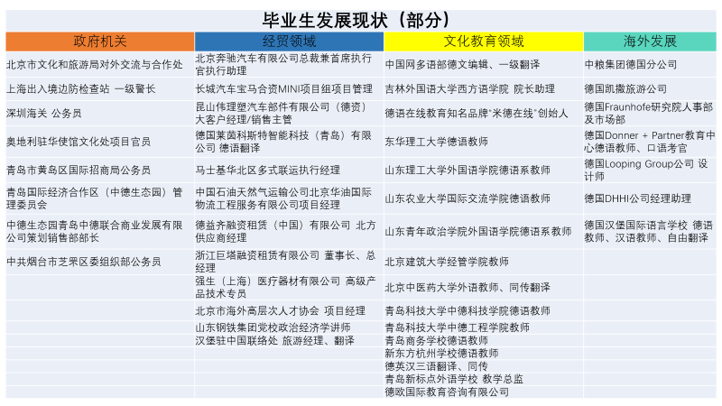 我系德语专业四、八级通过率和优秀率在同类院校中名列前茅,学生在各类竞赛中常有崭获,每年都有多名毕业生考入国内外大学继续深造。迄今为止,我系已向教育、文化、媒体、经贸、政府机关等各行各业输出了大量优秀的德语人才。