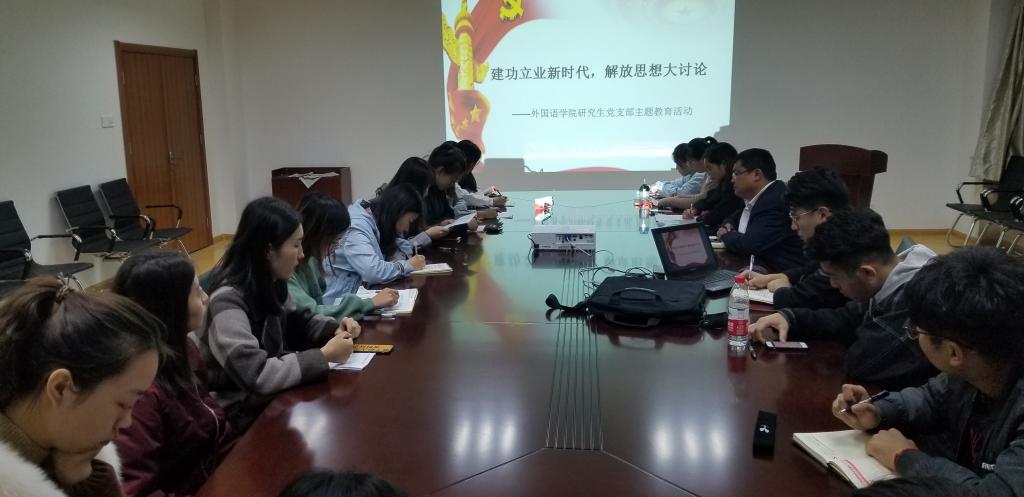 研究生党支部在党员开展了以“建功立业新时代,解放思想大讨论”主题教育活动,本次学习采取视频观看和学习讨论相结合的方式,由党支部书记宋飞同志主持。