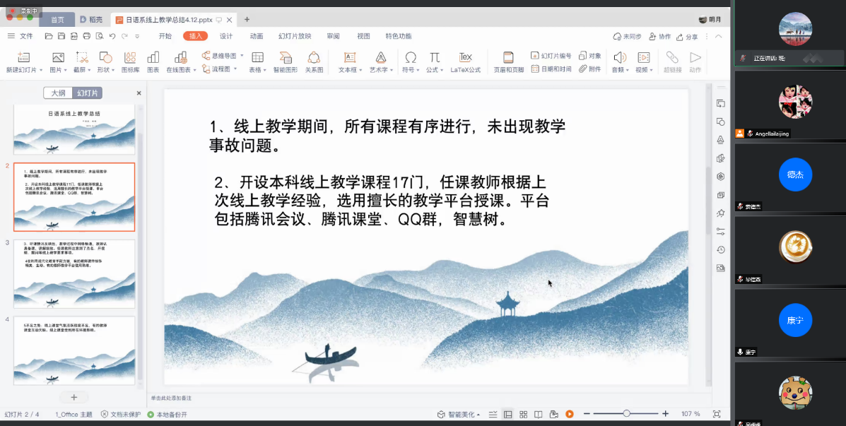 督导组听课情况进行了汇报。她指出,本次线上教学整体情况良好,授课平台运行平稳,过程流程,老师们态度认真,备课充分,课件设计精良,但也存在一定问题:个别老师授课平台信息上报不完整或更新不及时,授课内容单一,翻转课堂时间过程,在线互动效果不佳。