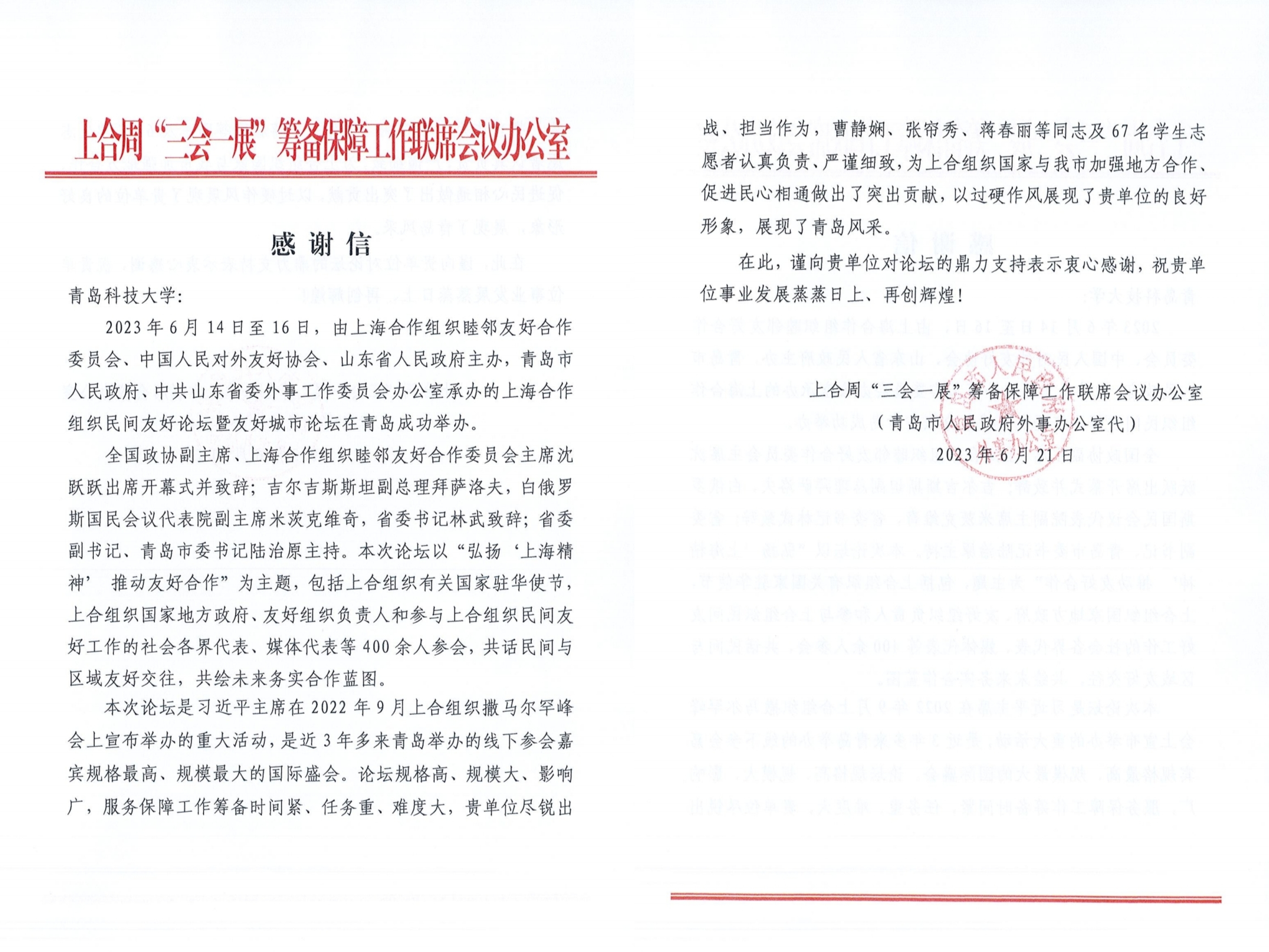 收到青岛市外事办感谢信,对7mmtv