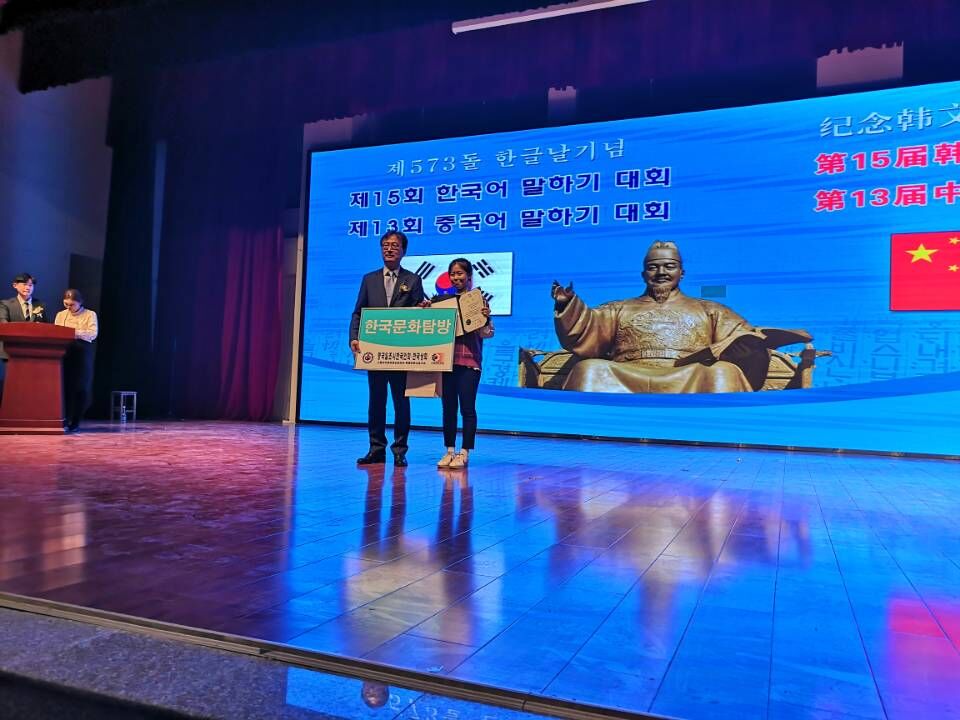 朝鲜语系16级宋雨桐同学参加第十五届山东省韩语演讲比赛,以优异的成绩获得“唐津市市长奖”,并获得韩国七日文化体验游的机会。