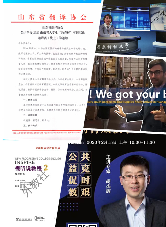 录制的大学英语精品课视频按教学进度通过QQ群发给教师做为备选资源。精选抗击疫情中体现正能量、家国情怀和人类命运共同体理念的英语视频,发给教师作为大学英语课程思政的补充材料。主动与教材出版社联系,获取教材电子版,通过教师转发给学生,解决部分学生回家没有教材的问题。提供直播链接,鼓励教师参加大学英语在线教学能力提升系列公益课程培训,结合自己的在线教学经历,扬长避短,不断提升教学能力。鼓励学生参加省翻译协会抗击疫情期间举办的英文写作大赛,以赛促学。开课前一周,所有任课教师与学生进行一到两次试课,确保第一周的顺利开课。