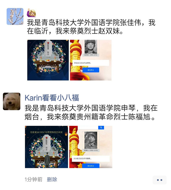 号召广大同学登陆“中华英烈网”,参与网上祭扫英烈活动,做文明祭祀的带头人。广大青年学生线上了解的英烈事迹,为在中华民族解放和革命事业中英勇献身的革命先烈,以及在新冠肺炎疫情斗争中的牺牲烈士和逝世同胞献花、祭拜、写留言寄语等,把对先烈的哀悼之情化作浓浓的爱国情怀,用实际行动向为中华民族和中国人民作出贡献的英雄先烈们致敬。
