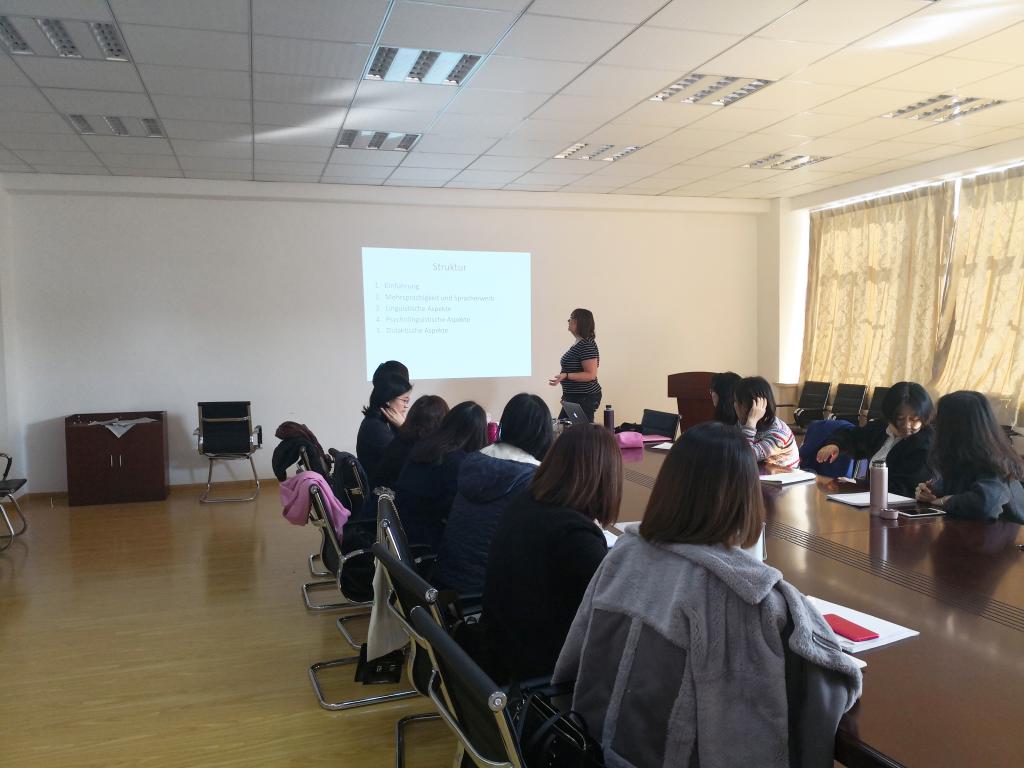 进行了为期一周的访学,期间共举办了三场学术报告,主题分别为《德国的多语化(Mehrsprachigkeit in Deutschland)》、《德语构词法之复合词(Wortbildung-Komposition)》和《二语习得研究心得(L2-Erwerb)》,并围绕《多语化和第三语教学(Mehrsprachigkeits- und Tertiärsprachendidaktik)》这一主题开展了为期三天的教师培训,7mmtv