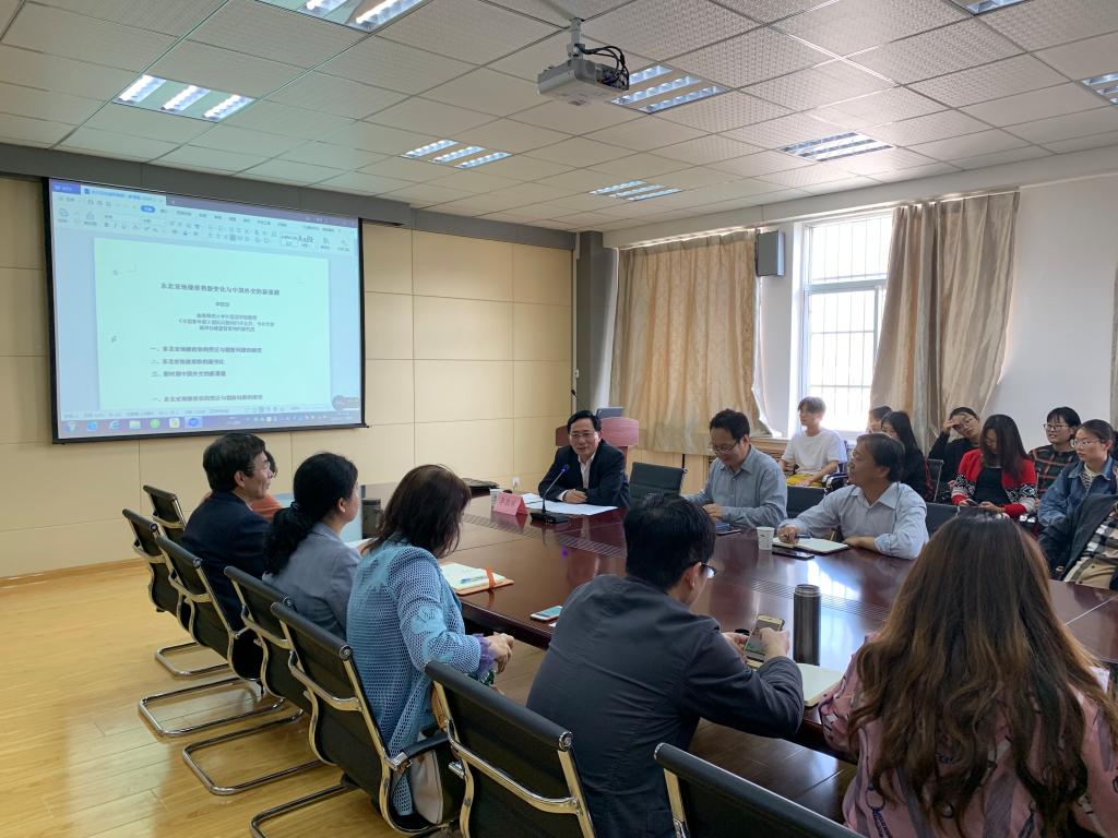 师生进行了题为《东北亚地缘形势新变化与中国外交的新课题》的学术报告。报告会由吕耀中副院长主持,院长尹洪山、副院长康宁、院长助理刘靖、朝鲜语系南明哲教授以及各系部部分师生参加了此次报告会。