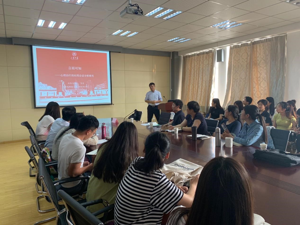 邀请,在外语楼517会议室做了题为《言而可知:心理治疗的应用会话分析研究》的报告。报告会由院长尹洪山教授主持,院长助理刘靖教授及部分教师和研究生参加了报告会。