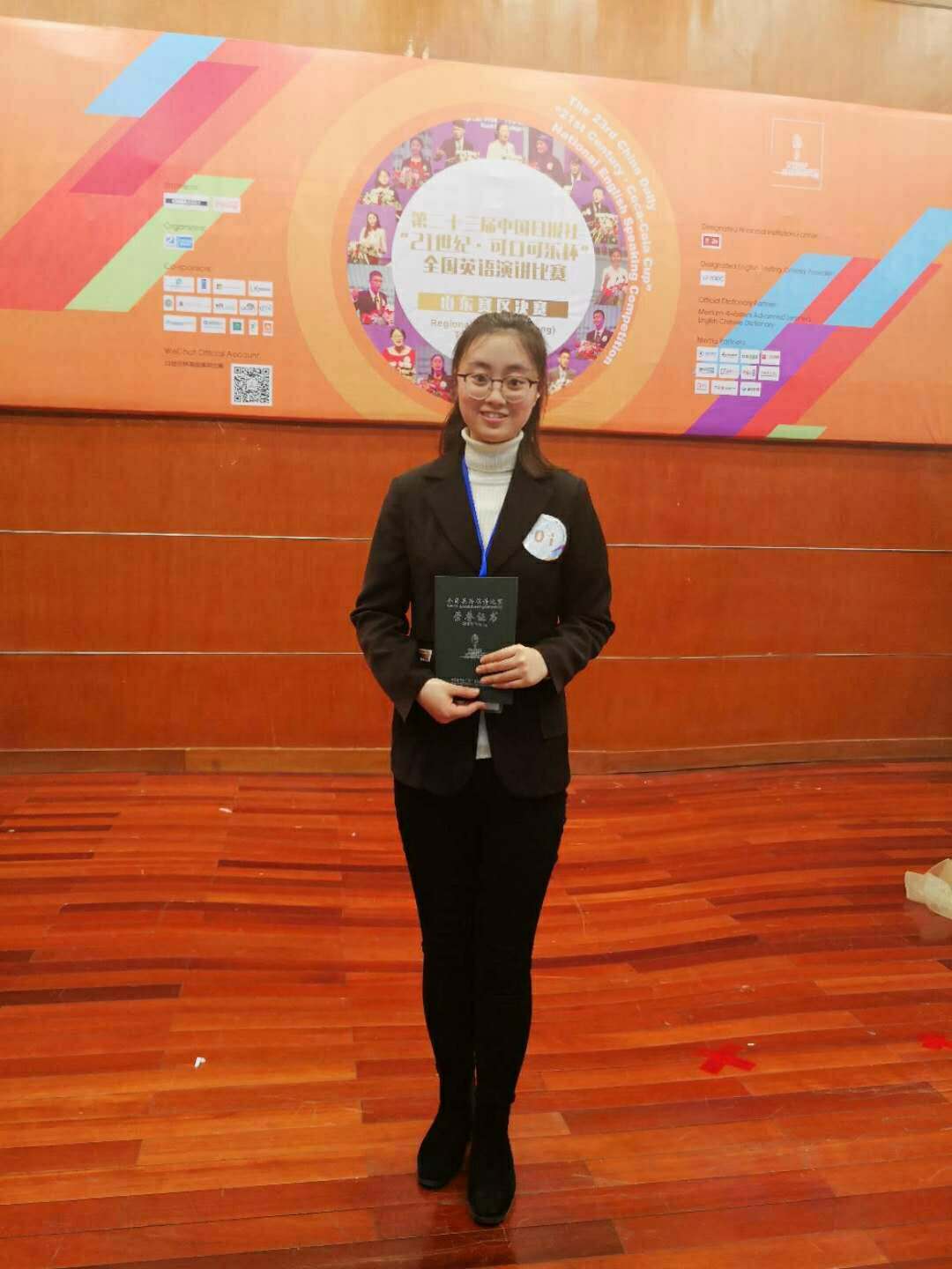 本次比赛分上下午进行,上午为2分钟即兴演讲和1分钟评委提问,根据比赛成绩排名,前9位参赛选手进入下午3分钟有备演讲,主题为: Belt and Road: China and the World。常菁同学以其标准流利的发音、缜密的思维逻辑、灵活的应变能力获得现场评委和观众的阵阵喝彩,以第三名成绩顺利晋级下午比赛,最终荣获一等奖。