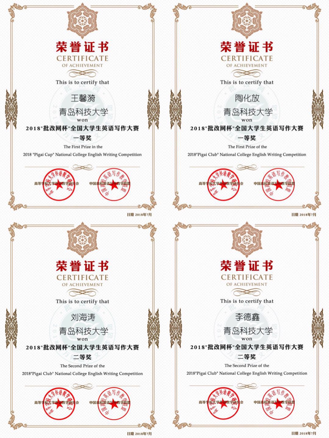 共有四名学生获奖,其中全国一等奖两名,全国二等奖两名。