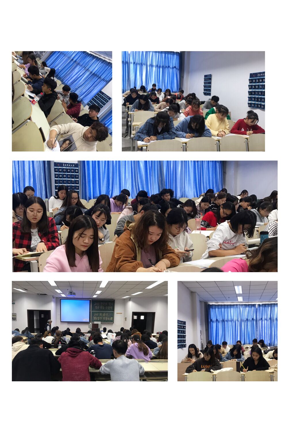 刘淑双介绍了比赛规则:大一新生进行韩字临摹比赛;大二以“我最喜欢的季节”为题进行一小时写作;大三大四则以“小确幸”为题进行一个半小时的写作。进行韩字临摹的大一同学一笔一画专心致志地书写。大二至大四同学时而停笔思索时而笔不停息,交上的文章洋洋洒洒一大篇。写作比赛完成之后,同学们一起观看了一部喜剧韩国电影,与此同时各位韩语系老师对作文进行批改,评选出了各个年级的获奖名单。