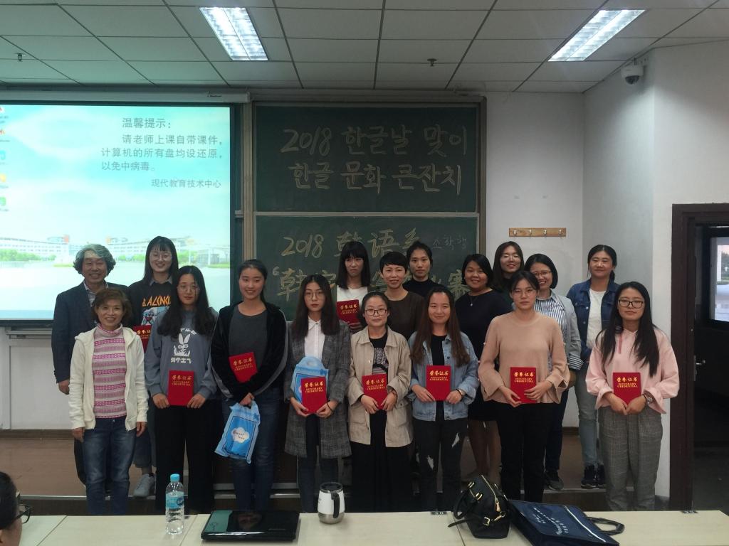 最后,活动进行颁奖环节。大一年级获得三等奖的同学是董一帆、宋漫宁;二等奖张凯妮,一等奖庞艺伟。大二年级获得三等奖的是梁学璐、王小燕;二等奖李奥婕;一等奖杜晓雨。大三及大四年级获得三等奖的是吴藤菲、薛春美;二等奖黄媛;一等奖于薇。老师对获奖同学进行了颁奖,并合影留念,同时大二至大四年级获得一等奖的两位同学可以赴韩国进行3至5天的文化体验。