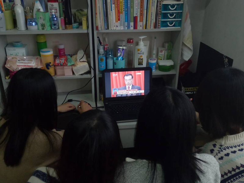 师生自发组织收看了十二届全国人大五次会议盛况,听取了李克强总理关于政府工作的报告。