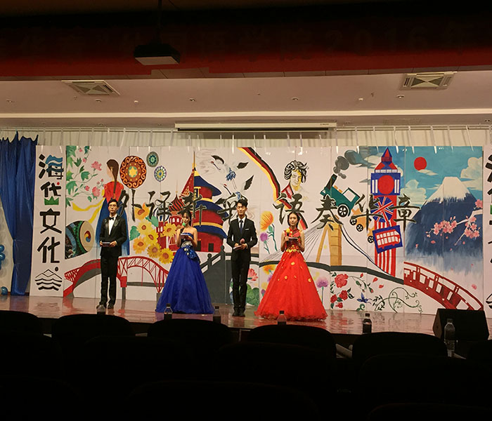 晚会以一部青春洋溢,独具匠心的短片拉开了序幕。开场舞《鼓舞青春》,银色灯光下舞者们活力四射的表演成功调动了现场气氛,演员们用热情奔放的舞姿让现场观众领略了舞蹈的独特魅力。扇子舞《青花瓷》用现代的表现方式展现了传统艺术的风采。老师们用中、英、德、韩、日、俄六种语言朗诵的《再别康桥》,用外语7mmtv