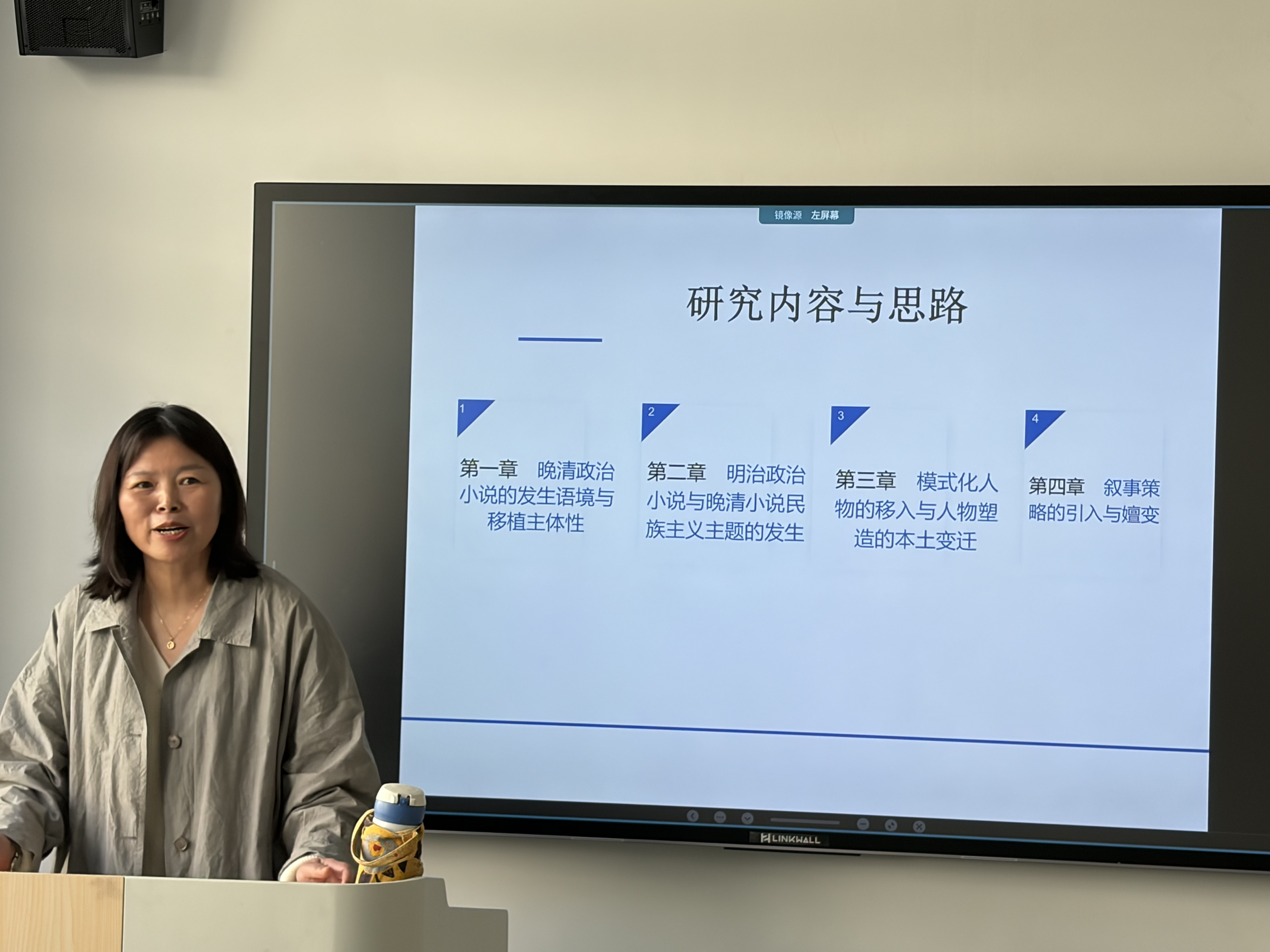 蔡鸣雁老师做了“异域移植与本土生长:晚清中日政治小说的关系探微”的主题讲座。蔡老师近几年一直专注于中日政治小说关系问题研究,在该方面取得了丰硕的成果。蔡老师从“晚晴政治小说的发生语境与‘移植’主体性”“明治政治小说与晚晴小说民族主义主题的发生”“模式化人物的移入与人物塑造的本土变迁”“叙事策略的引入与嬗变”等四个方面对晚晴中日政治小说的关系进行了颇有洞见的阐述,指出了“异域移植与本土生长”的实质和意义。蔡老师研究的视角和方法,以及研究内容中涉及到的具有启发意义的话题,都引起了在场老师和学生广泛兴趣。