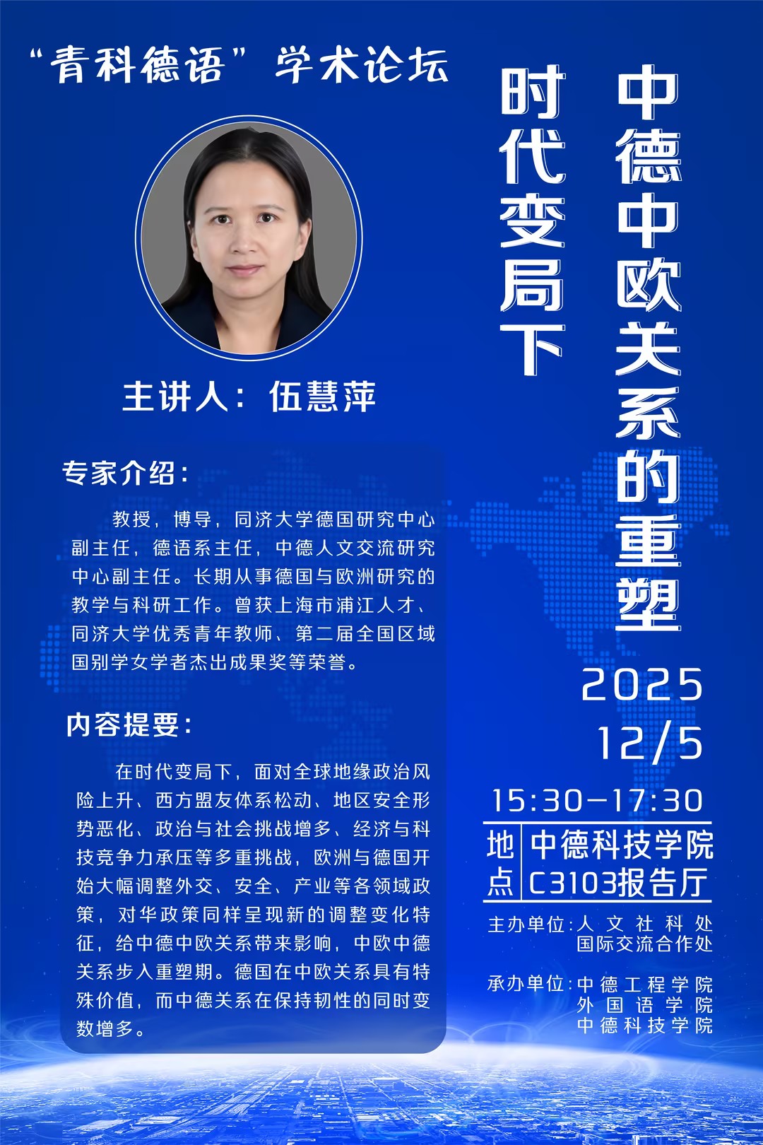 伍慧萍,教授,博导,同济大学德国研究中心副主任、德语系主任、中德人文交流研究中心副主任,兼任上海欧洲学会副会长、中国世界民族学会常务理事、《德国研究》杂志(CSSCI)副主编。曾在中国驻德大使馆政治处担任一等秘书外交职衔。