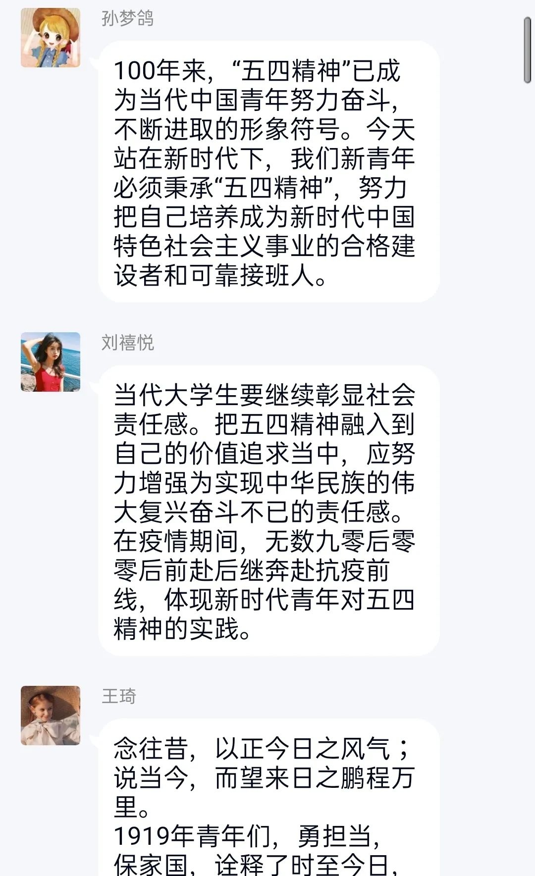 2019级各班积极响应院系要求,在五月一号开展了“传承五四精神,弘扬时代先锋”主题班会活动。