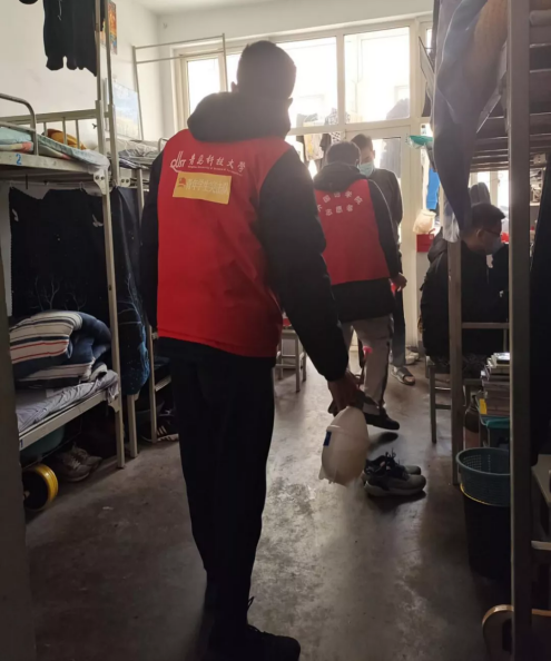 防疫领导小组成员深入学生宿舍,指导疫情防控工作,对隔离学生所在的男区五号楼407宿舍进行通风消毒等工作,有效保护同学们生活的良好环境。