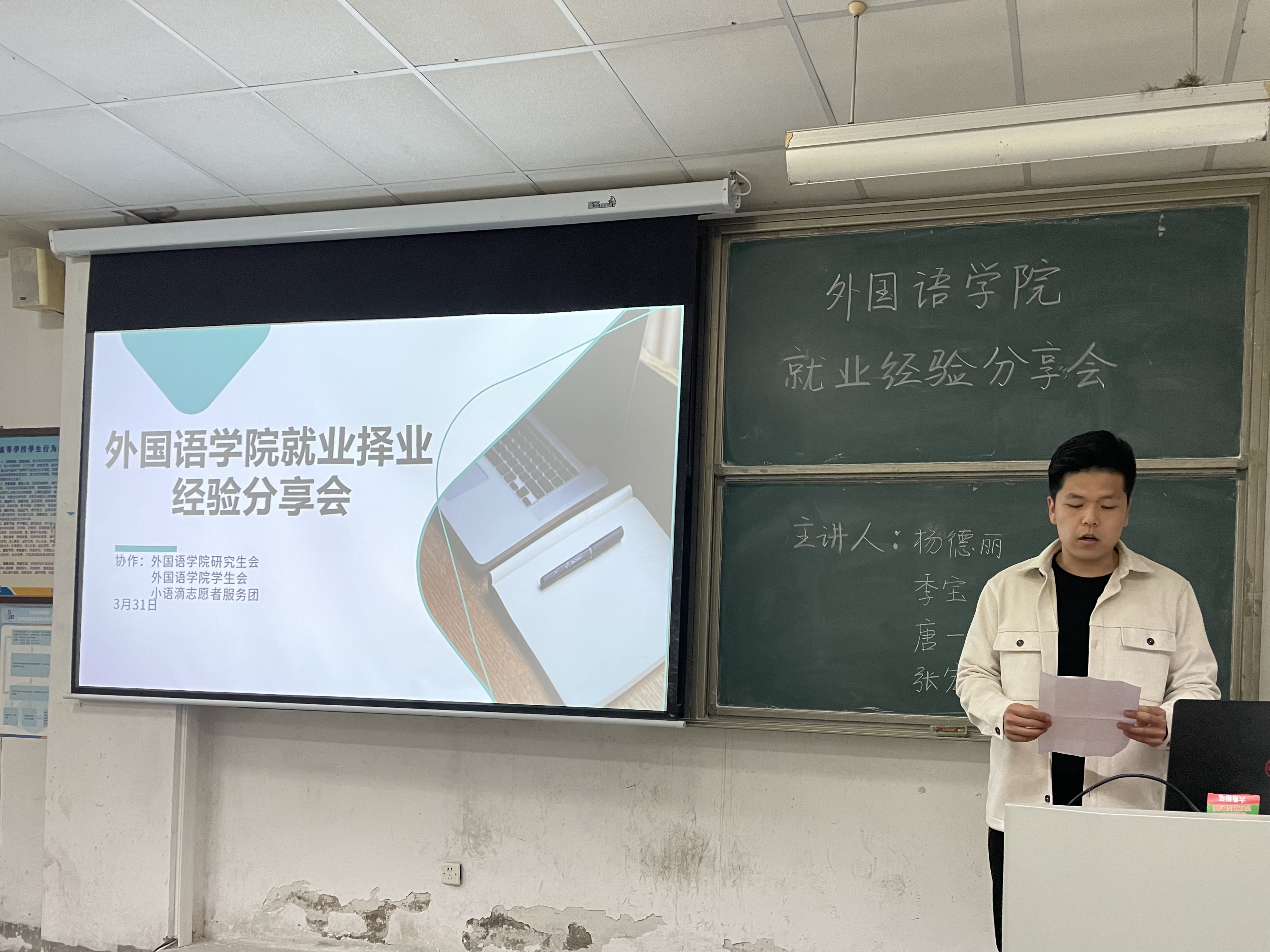 主持人首先做开场发言,说明了当代青年人就业的形势,青年就业任务艰巨。青年就业是世界性难题,我国也不例外,以高校毕业生为主的青年就业压力将依然突出。希望通过本次经验分享会能为同学们指点迷津,减轻就业的压力。