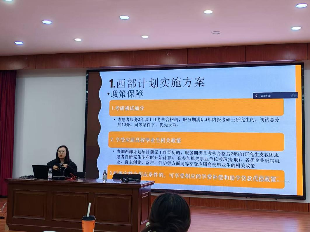 会议第一阶段,宗正分享了在四川省凉山火普村的志愿服务经历,谈及参加西部计划的初衷,他表示:“我想多做些事情。”生动诠释了青年服务基层的责任与担当。随后,王梦珂围绕西部计划服务领域、招募条件、政策保障、选拔流程等核心内容展开系统解读,深入介绍了西部基层建设需求与项目发展前景,为同学们答疑解惑。